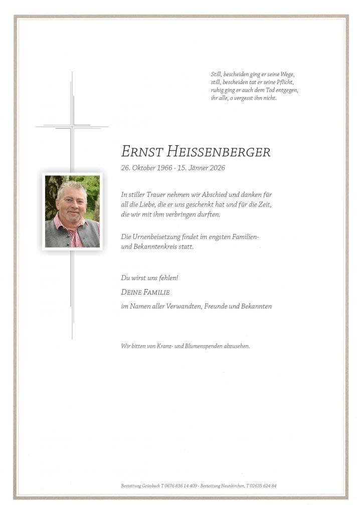 Unser tiefes Mitgefühl entbietet Familie Herbert und Manuela Mohr Grünbach Ernsti war ein besonders liebenswerter Mensch ich sende euch für diese schwere Zeit viel Kraft