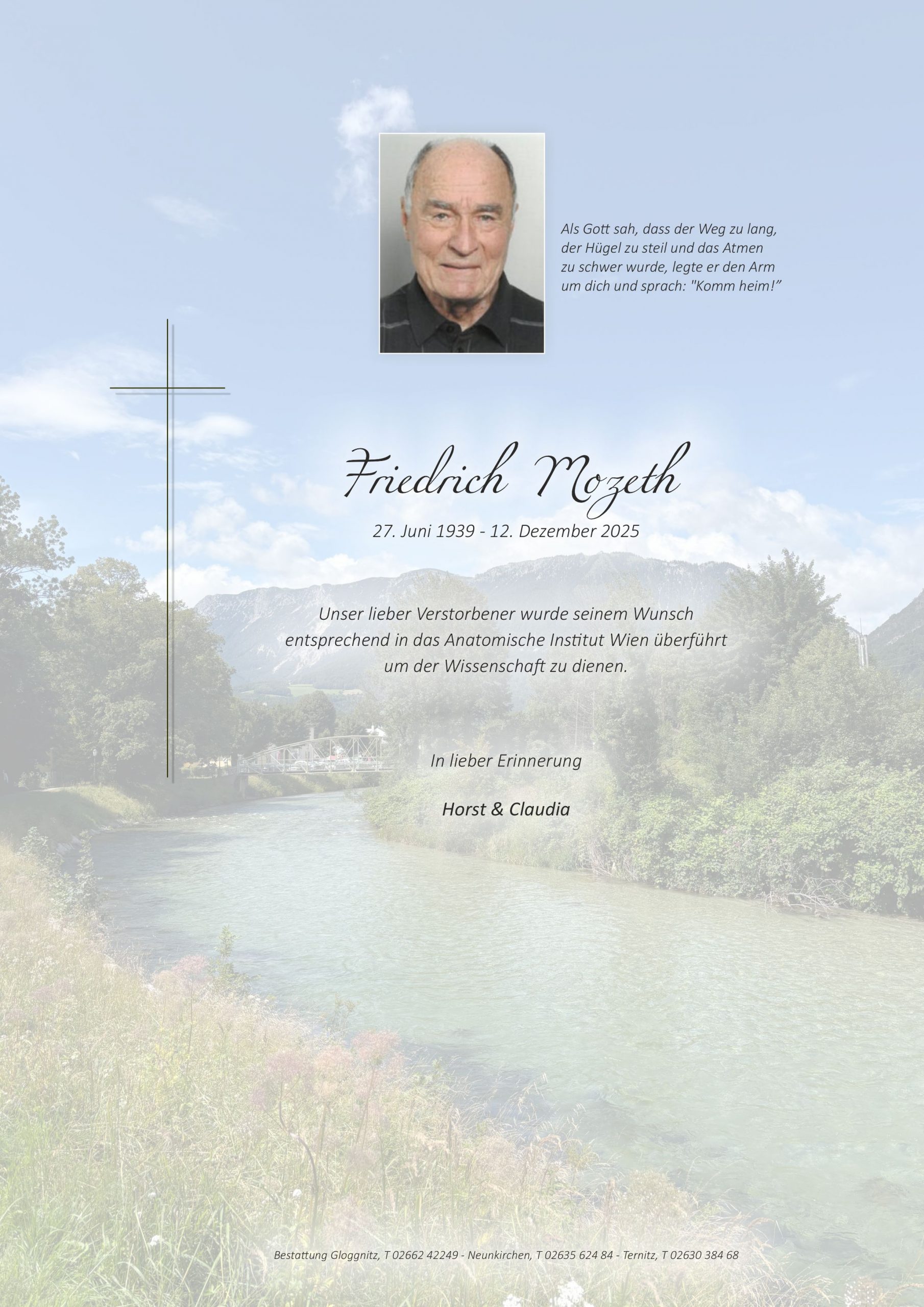 Herr Mozeth war einige Jahre unser sehr geschätzter Mieter,wir werden ihn in guter Erinnerung behalten. Unsere aufrichtige Anteilnahme entbieten Martin und Susanne Prasch