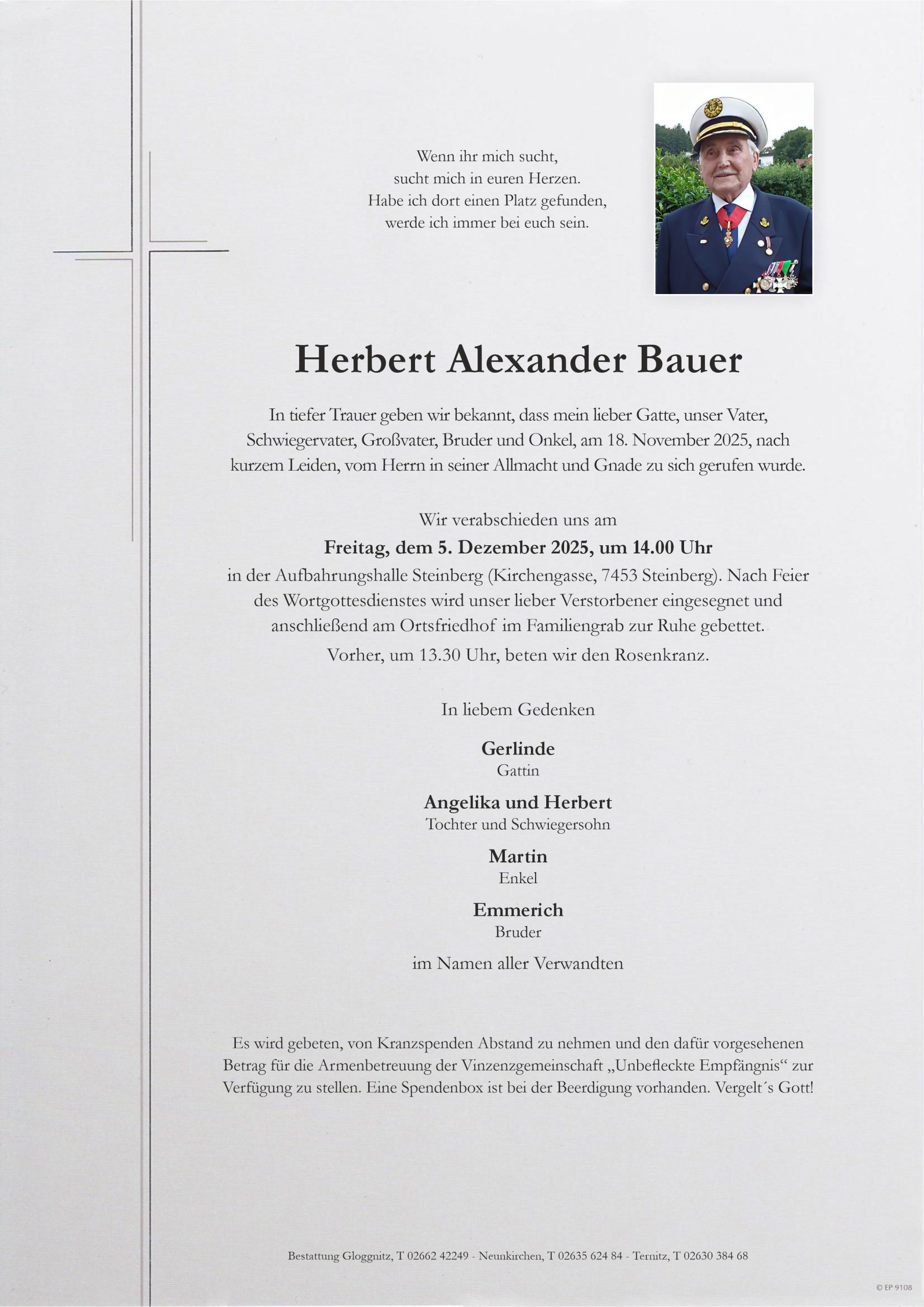 In ehrfürchtigem Gedenken halten wir inne vor dem Leben von Herbert Alexander Bauer, der am 18. November 2025 aus dieser Welt heimgegangen ist. Mit stillem Schmerz, aber im Vertrauen auf die Barmherzigkeit unseres Herrn, gedenken wir seiner Güte, seiner Treue und der Liebe, die er in seinem Leben verschenkt hat. Möge Christus, der Sieger über den Tod, ihn nun in das Licht und den Frieden seines ewigen Reiches aufnehmen. Die Spuren, die Herbert in den Herzen der Menschen hinterlassen hat, werden bleiben – als Zeugnis seiner Menschlichkeit und als Zeichen der Hoffnung, dass Gottes Hand auch im Dunkel unsere Wege hält. In brüderlicher Verbundenheit, im Glauben getröstet und im Gebet verbunden, verneigen wir uns vor seinem Andenken. Pater Mag Bonifatius von Tarsus OSB und der gesamte Ritterorden „Goldener Sporn“