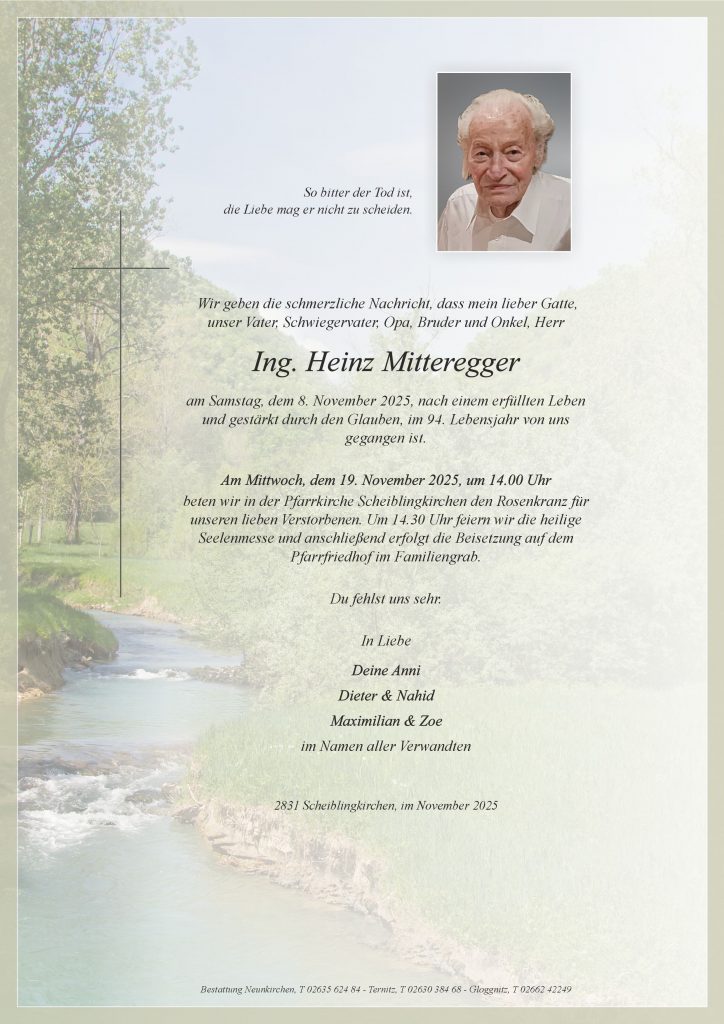 Liebe Frau Mitteregger, werte Trauerfamilie, meine aufrichtige Anteilnahme am schweren Verlust.