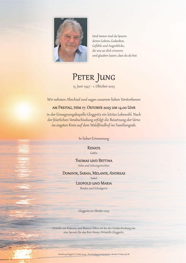 Liebe Renate, lieber Thomas, liebe Trauerfamilie! Unser aufrichtiges Beileid und tiefes Mitgefühl für euren schweren Verlust. 🕯️Peter, lebe wohl sagen wir dir leise, mach’s gut auf deiner letzten Reise😥Doris & Dominik